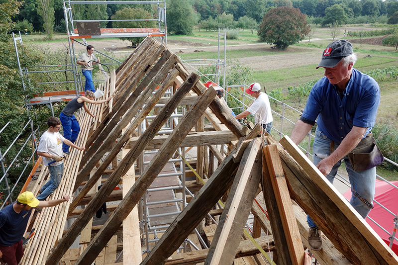 Chantier de remontage de Sundhoffen, station introductive du théâtre de l’agriculture, pendant une semaine avec une quinzaine de bénévoles venus pour l’occasion, des bénévoles de l’écomusée, le collectif etc, le tout sous la houlette de Guy Macchi – septembre 2016
