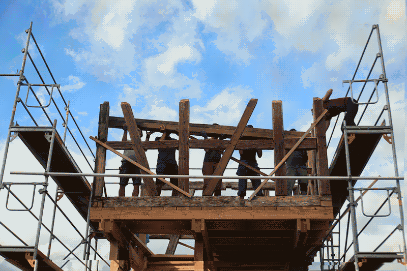 Le colombage se ré-assemble relativement vite. Une fois la structure ajustée, on verrouille en chevillant les assemblages. En amont, une équipe a préparé des chevilles dans l’atelier du charron, un sympathique exercice de marteau consistant à faire passer une pièce de chêne dans un emporte pièce de plus en plus petit jusqu’à obtenir le diamètre souhaité.
