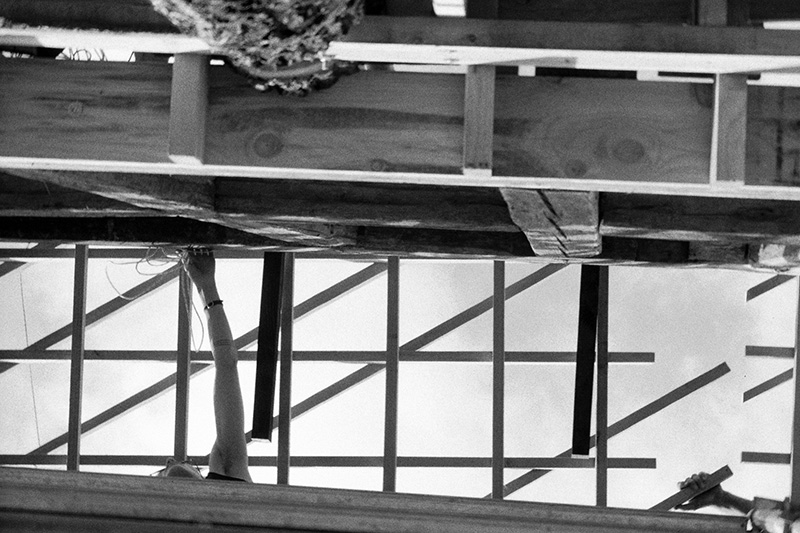 Une fois cette épine tirée du pied, on peut « commencer à travailler », c’est à dire attaquer l’ossature. D’abord on règle les niveaux, puis on balance le premier plan horizontal, la passerelle qui sert de premier balcon sur les champs. Puis on monte petit à petit, marche par marche, travée par travée. À chaque fois, on a l’impression qu’on approche de la fin. Mais tout prend plus de temps avec la hauteur. Et quand on finit enfin la structure du plancher, nos deux semaines de chantier initialement prévues sont terminées. On va devoir jouer les prolongations. Mais avant de commencer à remonter le colombage une vraie pause s’impose.