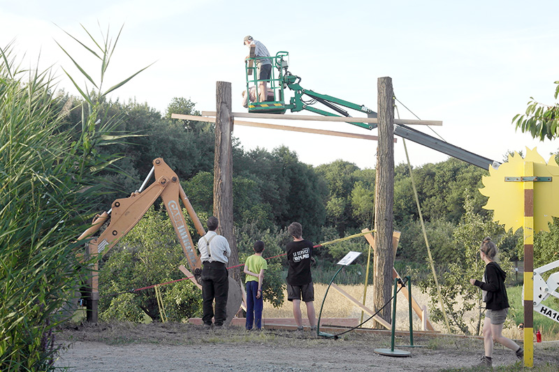 Le travail de préparation au sol prend tout son sens. Les pannes sont posées puis les panneaux de toiture hissés. Pendant qu’on couvre, les panneaux de façade sont levés au palan et s’assemblent rapidement. En quelques jours seulement le belvédère se termine. En parallèle, on peaufine la stabilité en révisant notre plan de contreventement. Et, petit clin d’œil à notre expérience du printemps au Havre, nous employons de l’ursus (grillage à mouton) pour finir les gardes corps de l’escalier et de la passerelle.
