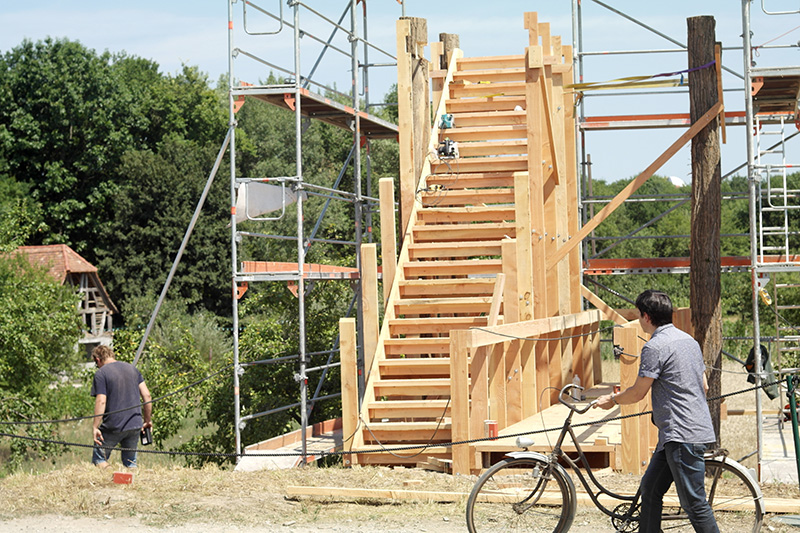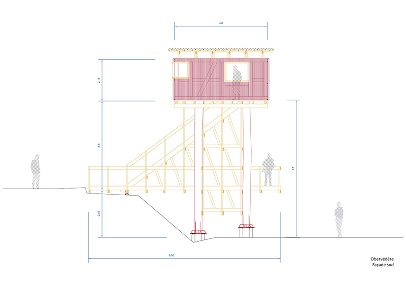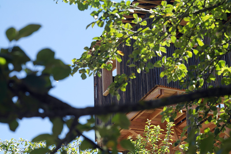 Les bois du colombage ont été triés, sélectionnés puis retravaillés, pour constituer un volume perché sur une structure composée de quatre troncs d’acacias (robinier) provenant du site même de l’Écomusée. Une ossature secondaire, en douglas des Vosges, est venue rigidifier l’ensemble en proposant un premier balcon en bout d’une passerelle ainsi qu’un grand escalier d’accès au belvédère.