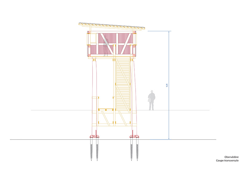 En parallèle de l’inventaire des bois de Oberhausbergen, plusieurs esquisses exploratoires ont été réalisées et ont servi de support de dialogue avec les membres de l’écomusée pour définir les intentions et ambitions architecturales du projet de belvédère. Des premiers croquis jusqu’au chantier, il se sera écoulé un peu moins d’un an, avec beaucoup d’aller-retours et de mises au point collectives. Au delà des questions de design, on appréhende un peu le volume et la hauteur. «Vous êtes sûr qu’on va pas se mettre dans le rouge ? Version light ou full dolby surround ? Non franchement ça passe ! »