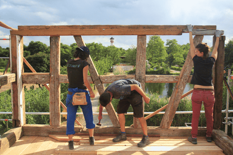 Après avoir contribué à réouvrir le site dédié à l’expérimentation constructive (festival Bauistella) avec la construction d’une passerelle et de plateformes flottantes, puis après avoir appris les rudiments du colombage en venant remonter une grange avec ses anciens charpentiers, l’Écomusée d’Alsace nous a missionné pour imaginer et réaliser un belvédère à partir d’un colombage provenant d’une maison de la commune d’Oberhausbergen (67).