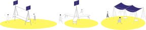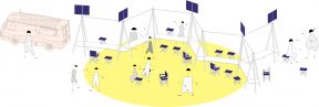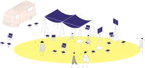 Au delà de la rénovation du camion J9, nous avons proposé de construire un “kit d’animation” durable qui se déploierait à partir du camion et permettrait à ce dernier de devenir un outil mobile de préfiguration capable de déployer, dans l’espace public, une variété importante de mobiliers et d’animations avec le dialogue intergénérationnel en ligne de mire permanente. Tel un campement sauvage dans l’espace public, nous avons pensé ce Kit avec un ensemble d’éléments combinables selon les activités proposés. Cette scénographie se déploie rapidement dans l’espace public grâce à du mobilier léger. Des tabourets et chaises pliantes, des tables et tréteaux, et des structures tripodes qui permettent de créer une signalétique forte et l’installation d’une toiture pour les jours d’été.