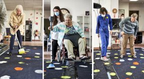 Afin de fabriquer du mobilier léger nous avons décidé de travailler avec Benoit Bonnefrite à partir de textile coloré. Nimes étant connu pour son textile Denim, nous avons opté pour du tissus offert par une société amie l’atelier Tuffery. Pendant une semaine, nous avons encadré des ateliers de peinture créant ainsi des fresques de tissus géant. Les résidents des EHPAD étaient alors invité à participer à cette grande colorade, avec musique d’ambiance bien entendu. Avec l’aide des étudiants, nous avons fabriquer des objets pour peindre, tracer, et tamponner à partir de matériel médical usager. Une fois séché, il s’agissait de découper, coudre et adapter ces bouts de tissus au mobilier du kit animation : tabourets et chaises pliantes, drapeaux, toitures, rideaux. Tout les jours de la seconde semaine, les résidents et habitants du quartier étaient invité à venir nous filer un coup de main pour apprendre a coudre du jean peinturluré.