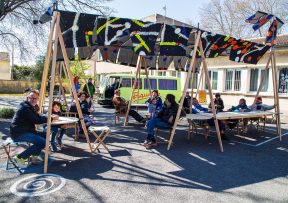 Meanwhile, we created them a kit to organise activities in city’s public spaces. Then, for a few years, they can use it to take people out of the retirement home in the steets and borrow it to other associations to they start create bonds and gather people for the next steps. All of it fit into a truck we have adapted : furnitures, textile roofing, tables. And all of it was made on site, with retired people and students from art and design, as a cultural. A diverse group in a joyful workshop. We worked with jean denim, because we’re in Nîmes, were is was firest created. That is thanks to Atelier Tuffery who offered the fabric.