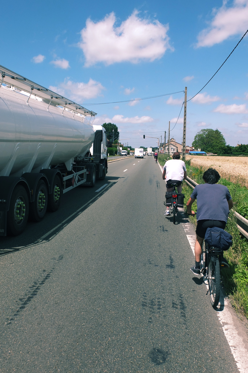 « Contourner les voitures mal garées, éviter les nids de poules, réparer une crevaison, revenir sur nos pas quand on est allé trop loin, zigzaguer dans les champs de blés, réparer une crevaison, se ranger pour laisser passer les poids lourds, puis faire un détour par les hortillonnages. Paris-Amiens c’est tout droit ? C’est ça ouais ! »
