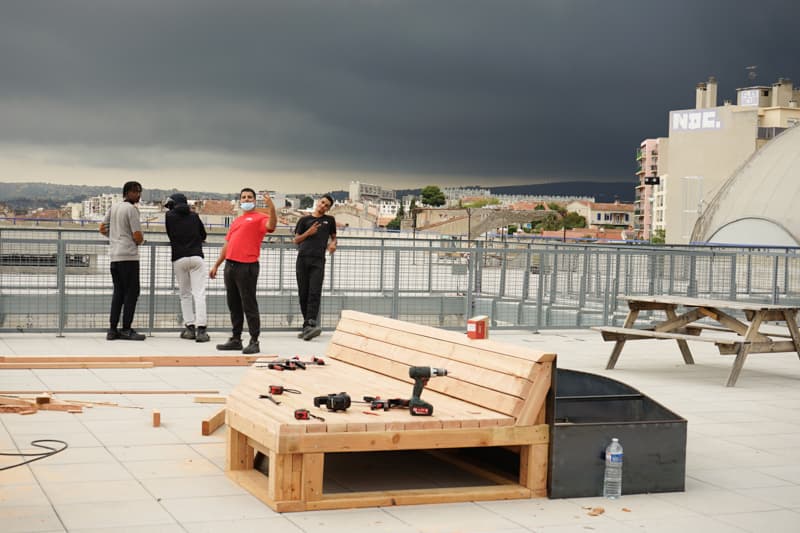 Dans ce cadre, nous avons été approché par la Friche début 2020 pour mener des chantiers d’encadrement de jeunes pour concevoir et fabriquer les premiers éléments d’un futur jardin partagé sur le toit terrasse. Quand un équipement culturel utilise son développement architectural au service de l’émancipation des jeunes du quartier, c’est bon signe !