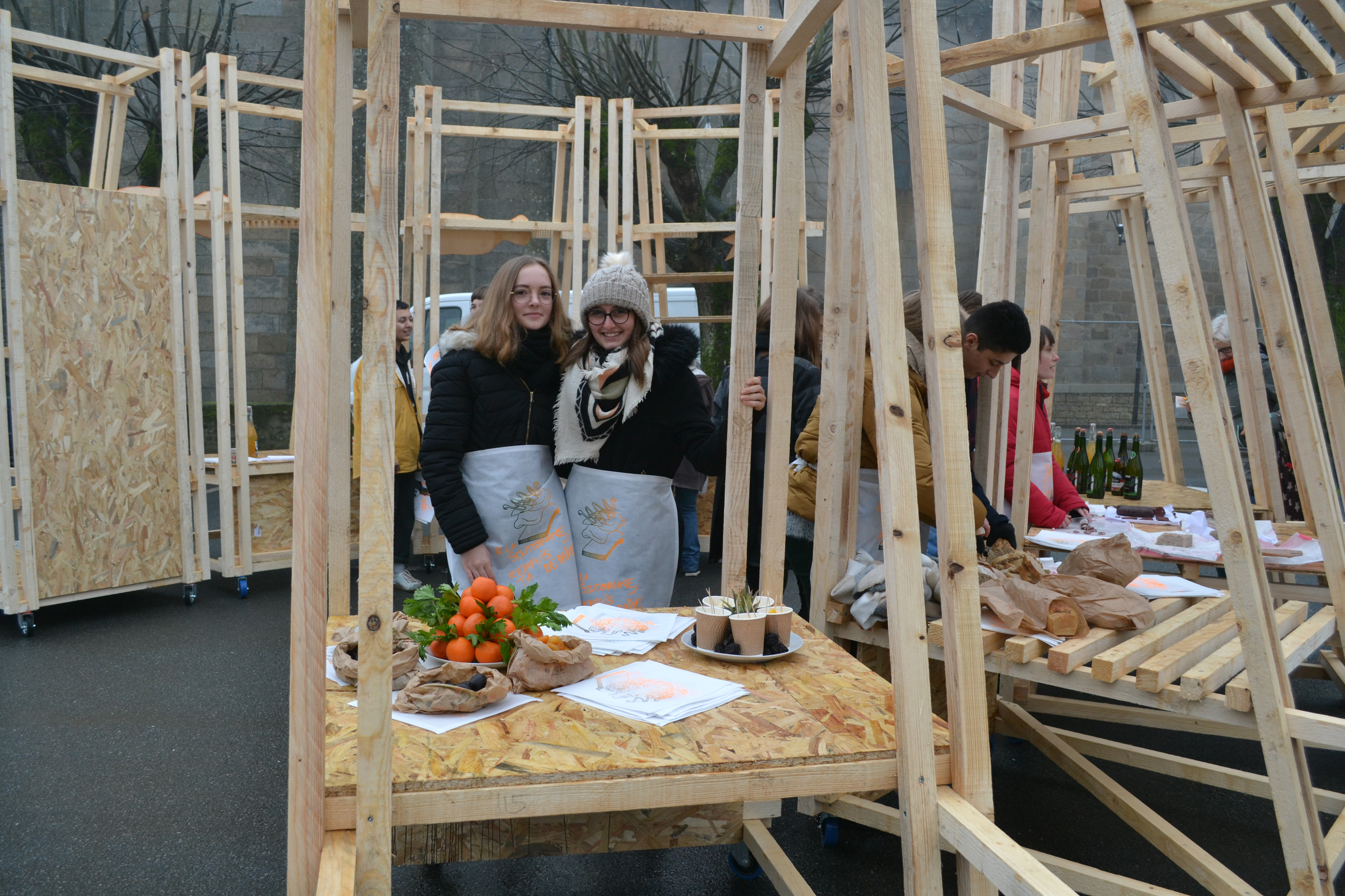 En lien depuis quelques mois avec les producteurs du marché, ils avaient pour mission d’analyser, penser et concevoir une installation conviviale avec un produit spécifique du marché. Notre venue sur place concrétisait le travail d’ébauches en rassemblant leurs idées, nous inventions de nouvelles formes de mise en œuvre.