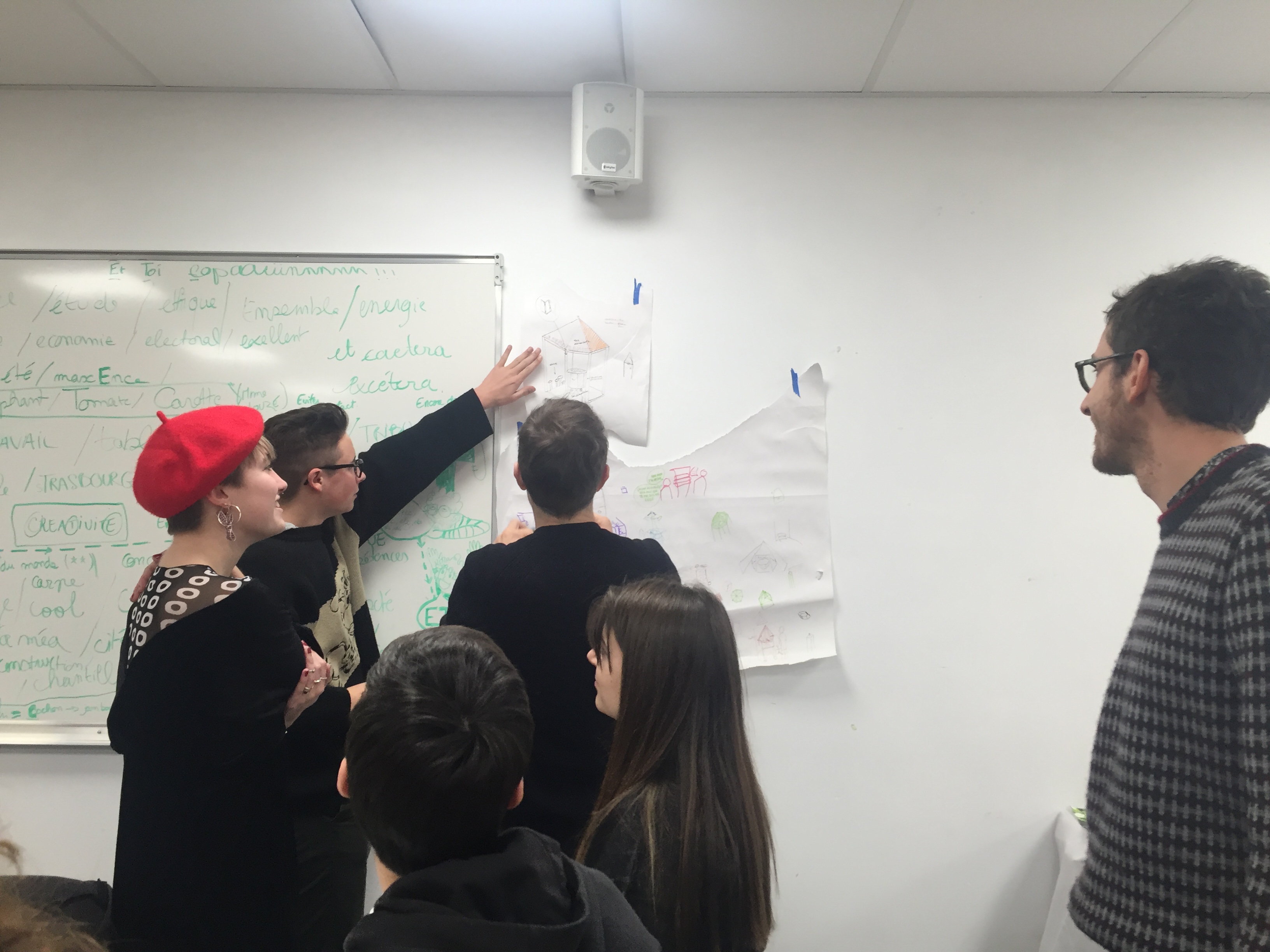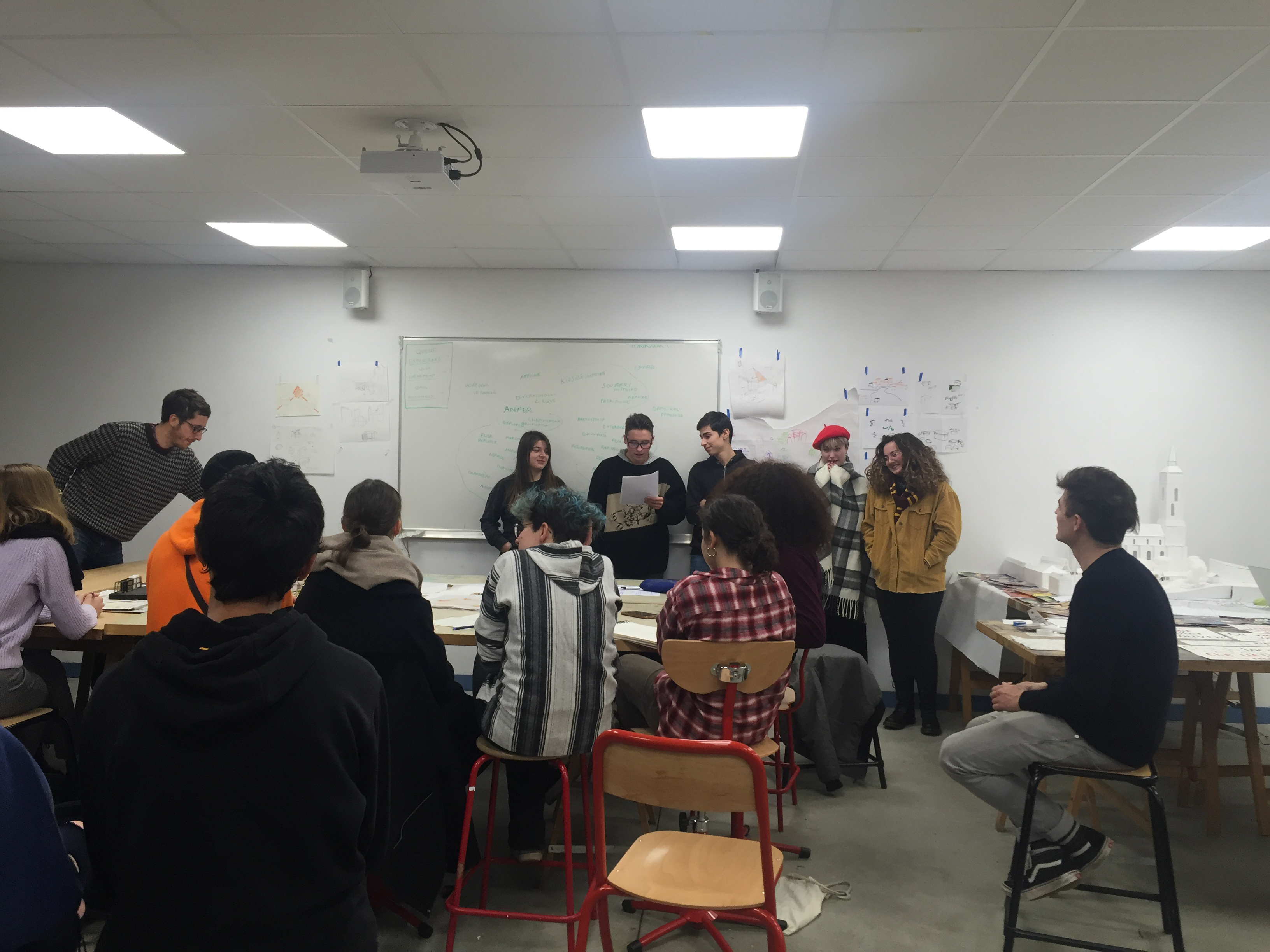 Le workshop est la conclusion de 4 mois de travail porté par les lycéens qui se matérialisera durant la semaine par divers ateliers. Nous arrivons donc sur un terrain défriché : la quantité et la qualité du travail fourni nous surprend. Encadrés de trois excellentes professeures, les élèves ont travaillés sur des médiums variés pour arriver à des propositions de construction assez abouties. La grande salle dans laquelle nous nous installons dès le premier matin témoigne par les maquettes, les différents dessins de projets exposés aux murs et au sols d’un véritable espace de création approprié par les élèves dans une école qui prête à ça, sans commune mesure.