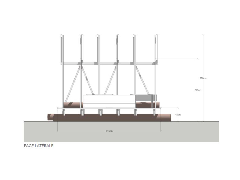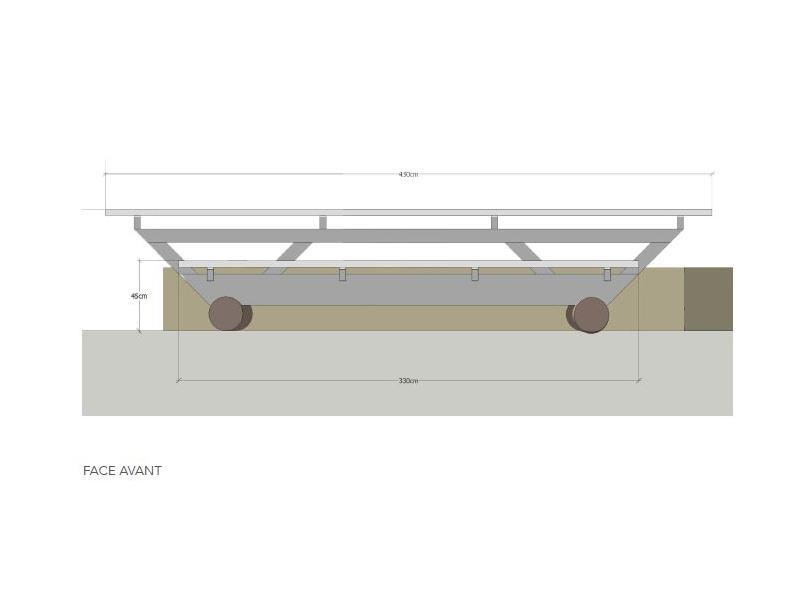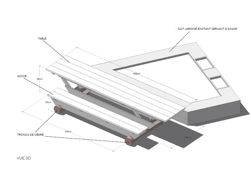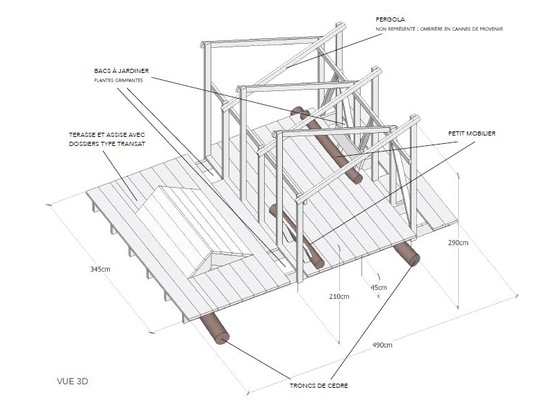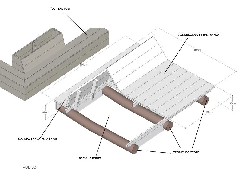 Nous avons décidé de condenser les constructions en trois îlots qui répondent et prolongent l’aménagement commencé l’année dernière. Au programme : un îlot table et banc, un banc et transat, et le fameux pergola et terrasse. (dessins réalisés à postériori)
