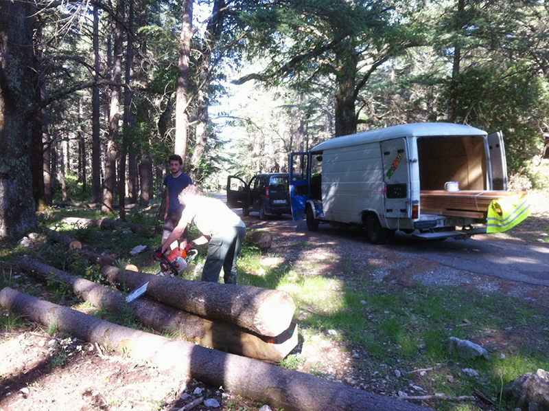 Fin mai, de retour du Havre, on s’est donc retrouvé avec les copains pour ce deuxième chantier. Nous avons commencé par un premier rendez-vous avec Georges, de l’ONF, dans la forêt de cèdre du Lubéron, pour récupérer quelques troncs qui serviront de base à nos nouvelles constructions, en mode radeau.