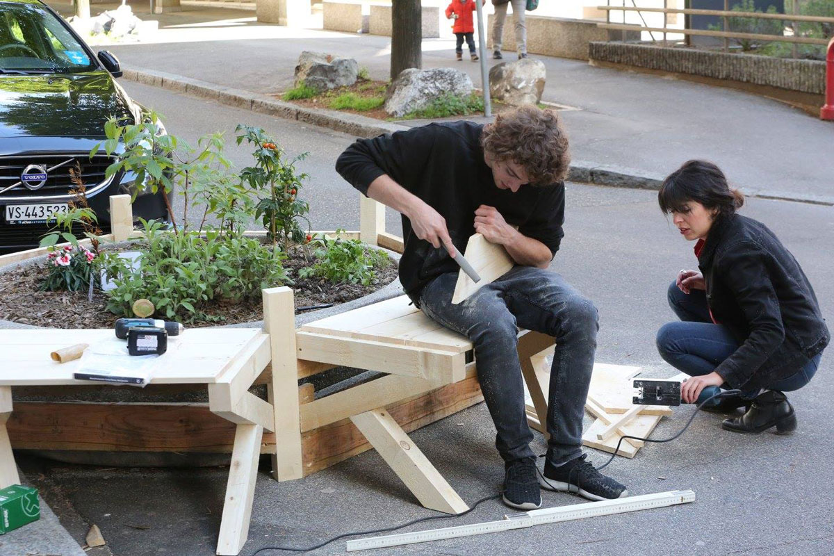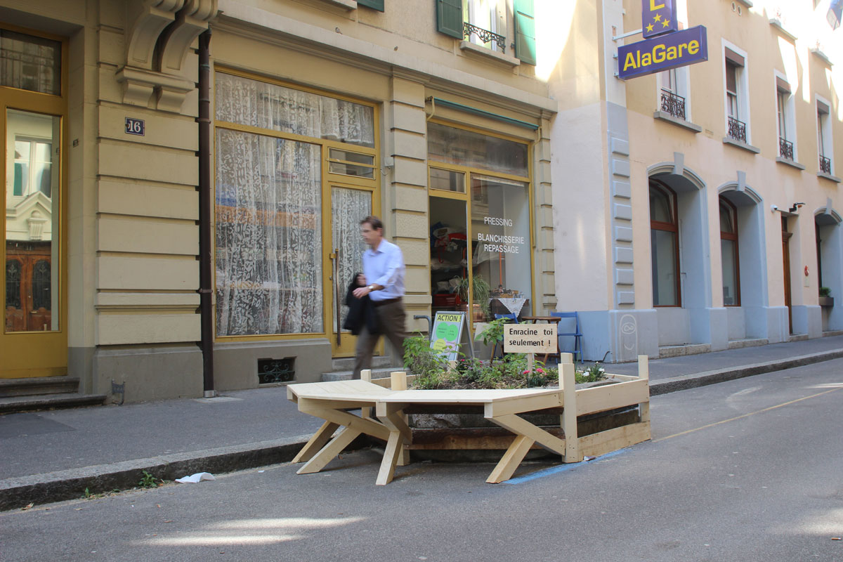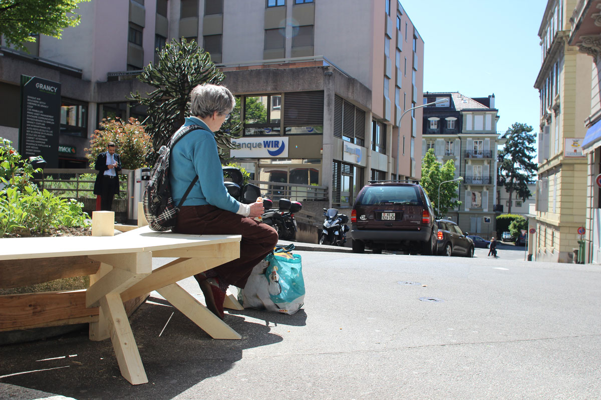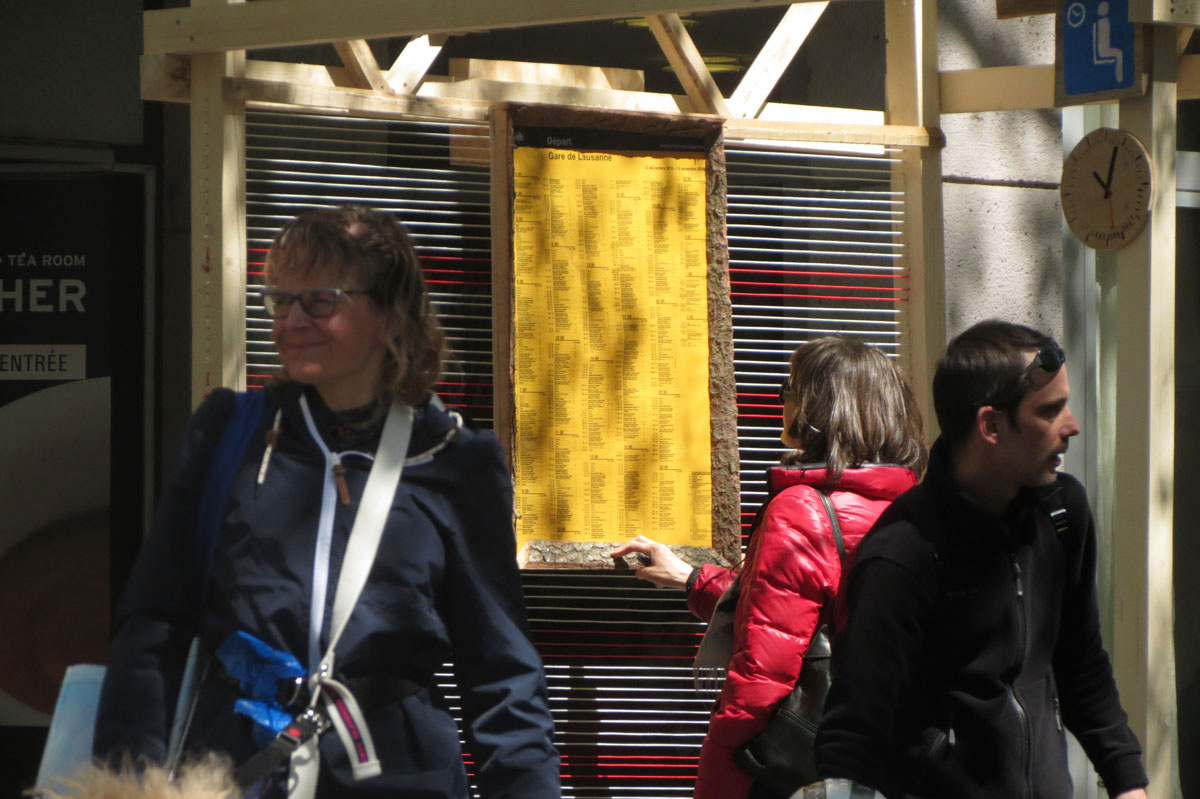 Lors de la présentation du projet de future gare par les CFF, il a été annoncé que la largeur des quais serait réduite, et qu’ils n’accueilleraient plus de mobilier. L’aménagement prévu vise à inviter les voyageurs à venir patienter dans les sous-sols qui seront pensés comme une grand galerie commercial. Le groupe d’étudiant a voulu réagir à cette (triste) nouvelle. Le projet est une suggestion faite aux utilisateurs des trains. Ils doivent pouvoir venir attendre dehors, dans une ambiance de quartier (et sans consommer) plutôt que de rester dans la « machine » gare. En se greffant au mobilier existant, ils ont transformé le mobilier urbain en mobilier de gare, provoquant des discussions. On y a vu des voyageurs chargés de valises croiser des riverains qui venaient acheter leur pain.