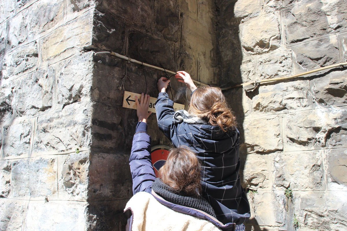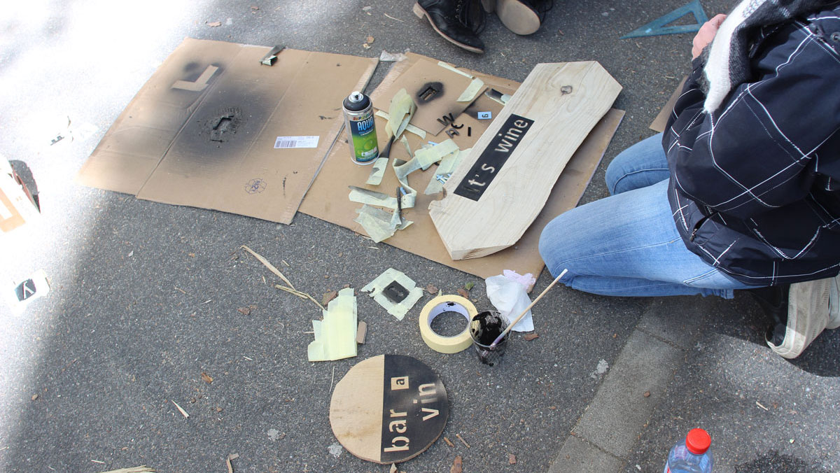 Une dernière équipe d’étudiants a choisi de mener une démarche moins construite, plus diffuse. Ils ont passé une journée à interviewer les passants, ils ont mis au point un système de pochoir découpé au laser dans les grandioses ateliers de l’école, puis ils ont réalisé une série de panneaux qui venaient retranscrire des éléments de leur collecte ou poser des questions. L’idée était de donner à voir une strate invisible au passant, d’inviter voyage.