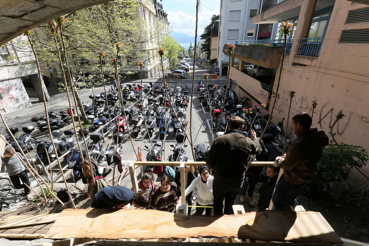 En avril 2016, nous avons été invités par l’EPFL, l’école d’architecture de Lausanne, à encadrer un workshop de construction. Jade Rudler, doctorante, nous a proposé de l’accompagner pour permettre la mise en place d’interventions légères réversibles qui pourraient venir questionner les changements à venir autour de la gare. Les CFF (SNCF de Suisse) ont lancé un grand projet : Léman 2030, sur 15 ans, pour agrandir toutes les gares le long de l’arc lémanique de Genève à Lausanne. Les gares et les routes sont trop souvent saturées. A Lausanne, le projet s’appelle Pôle Gare. Porté par la ville, il vise à agrandir la gare principale. Les transformations vont profondément modifier sa relation à son parvis et aux quartiers qu’elle côtoie.