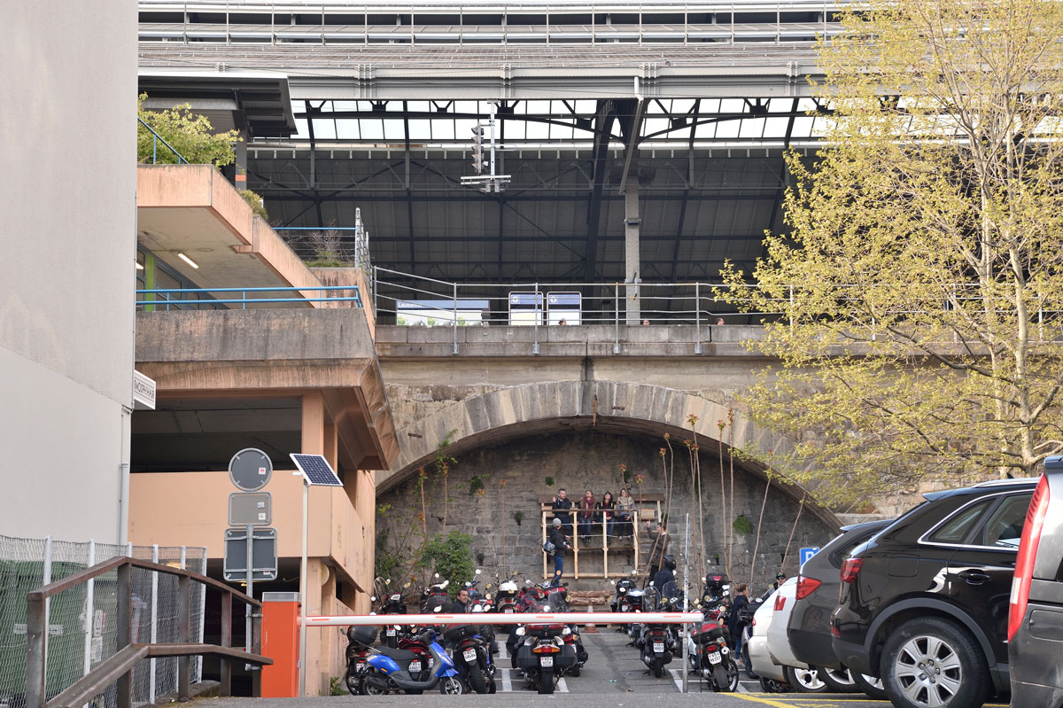 La promenade de la ficelle relie la lac à la gare, mais elle débouche sur la gare dans un grand parking deux-roues, puis dans une arcade du mur. Le projet Pôle Gare vise à ouvrir la gare à cet endroit et à reconnecter enfin la promenade. Les étudiants ont choisi de suspendre un belvédère qui permettait aux curieux de venir observer la vue sur le lac. Ce mobilier a été victime de son succès, la quantité de déchets générés par son utilisation passionnée a fini par fatiguer les services en charge de la propreté aux CFF. L’équipe du projet est revenue installer un poubelle et des panneaux d’information, en vain. Après quelques mois de loyaux services, les CFF ont finalement démonté la structure. Qui viendra nettoyer le futur parvis de la gare ? La question a été posée !
