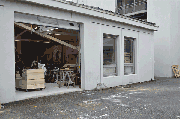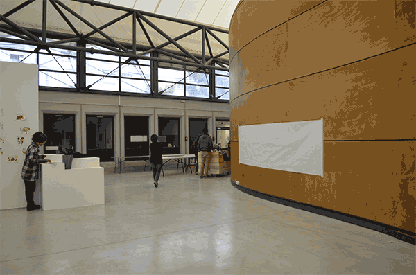 Cette année, le groupe organisateur a décidé de mettre le workshop à contribution d’un sujet brûlant : à part un petit, les étudiant-e-s ne disposent pas d’espace pour cuisiner et se réunir. Il y a bien le hall central aux airs de chapiteau, mais il n’est pas permis de l’investir, à part pour des expositions temporaires. Le parking de l’école est alors devenu le lieu de réunion pendant les pauses et les repas, ses bordures en béton faisant office de bancs. Mais l’établissement fera bientôt l’objet de travaux d’extension qui vont considérablement réduire cet espace, et risquent de compromettre la porosité et la convivialité, déjà timides, de l’école. Il serait alors idéal d’investir son parvis avant, plus vaste et ouvert sur le quartier, mais la ville en est le propriétaire.
