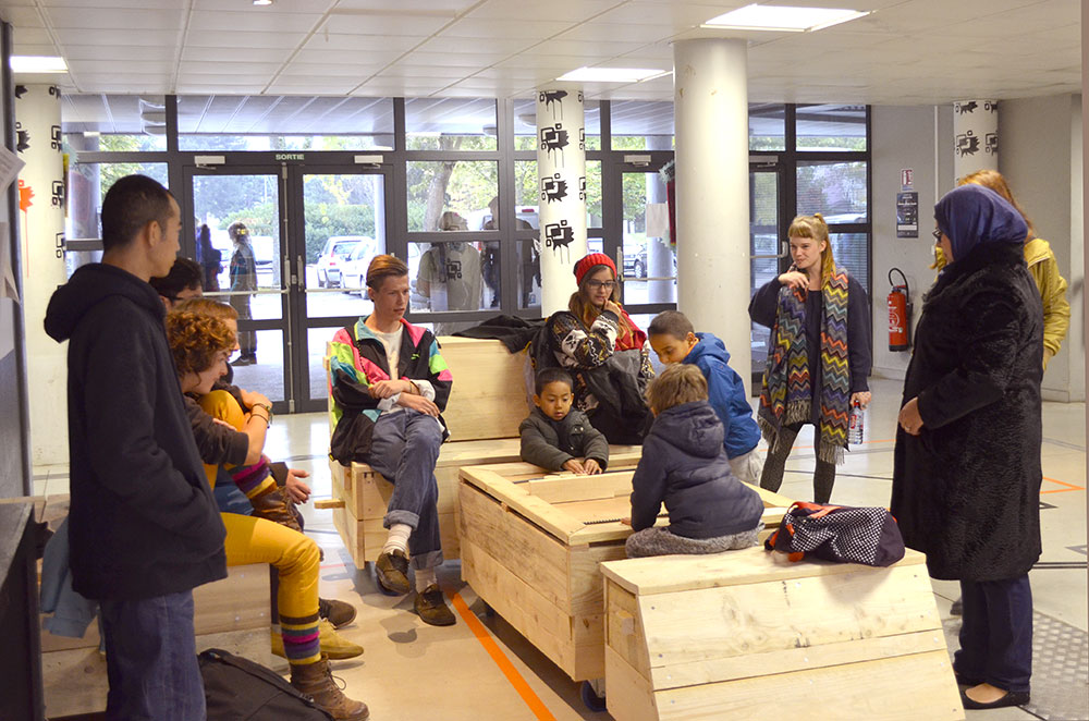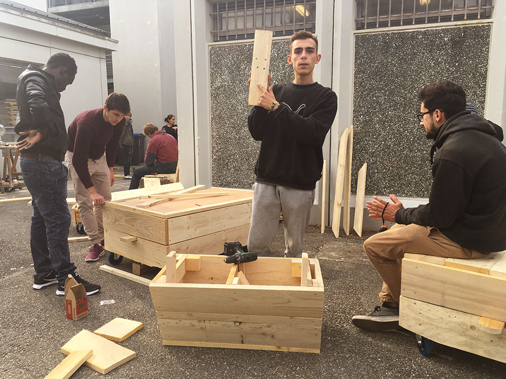 Alors, au delà de l’expérience initiatique de début d’année, ce workshop devait permettre aux étudiant-e-s de développer des solutions pour mieux habiter leur école, tout en contournant l’impossibilité d’installer des éléments de mobilier à l’intérieur comme à l’extérieur de son enceinte.