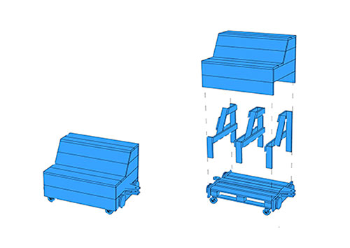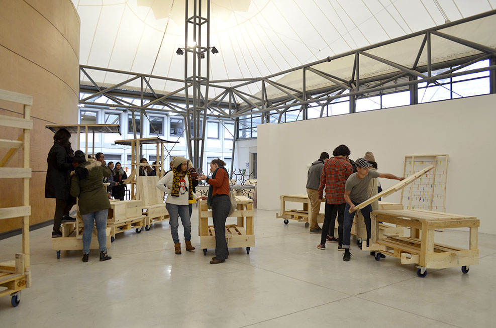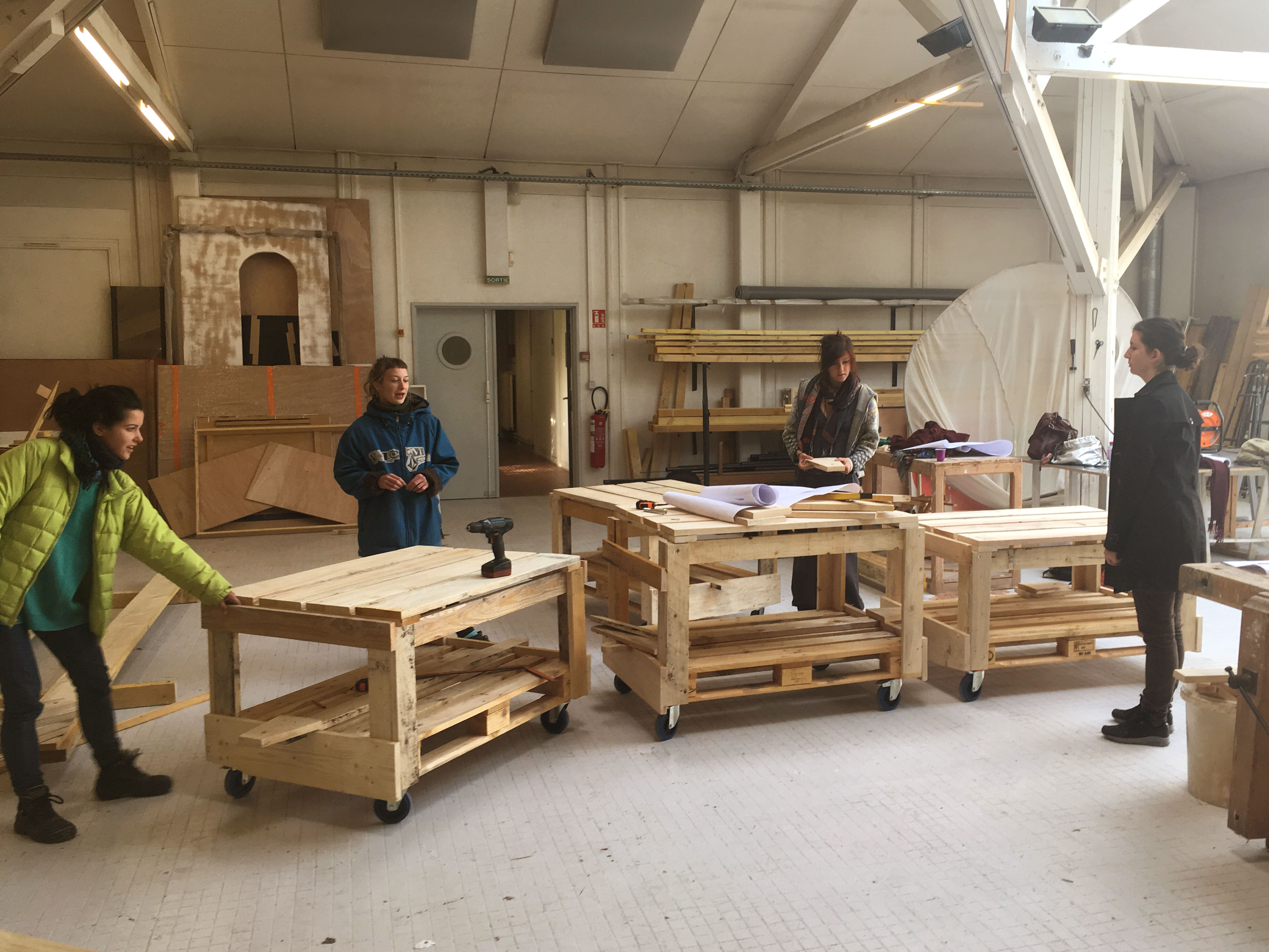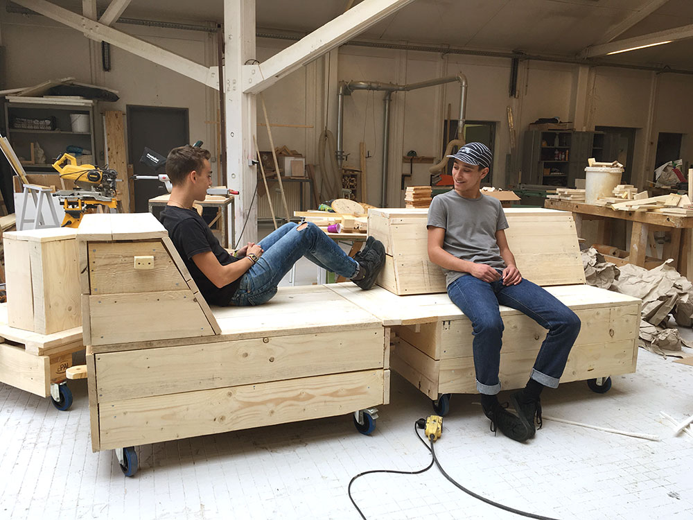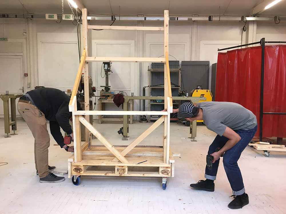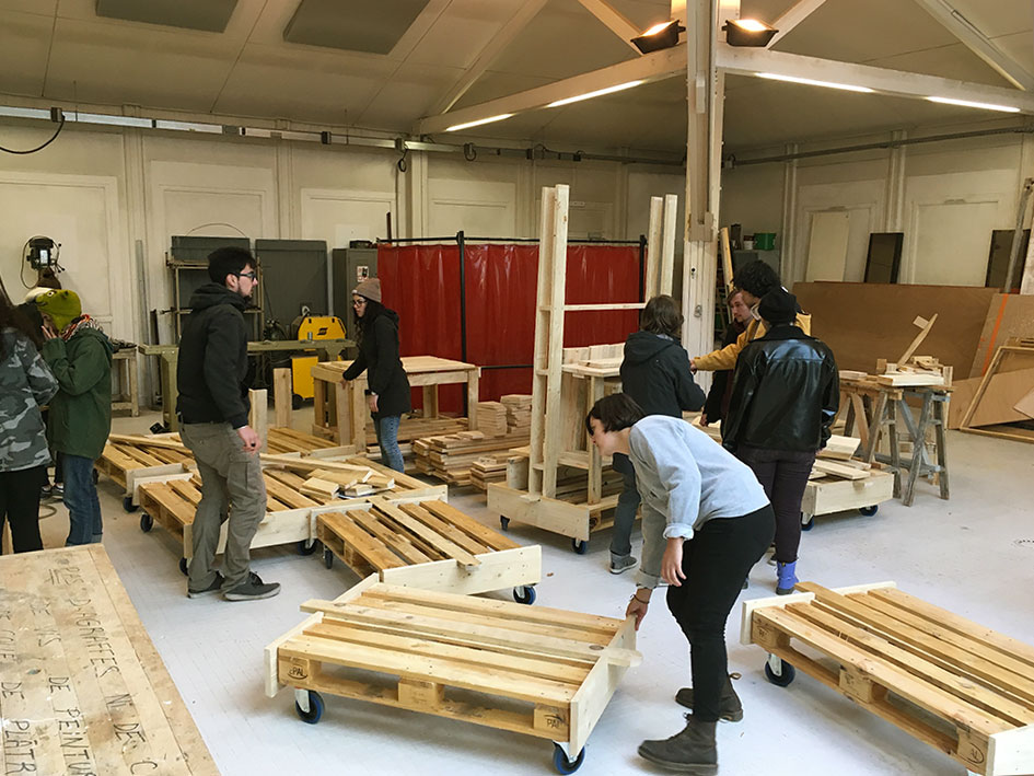 La durée du workshop étant très courte, nous avions défini à l’avance le principe de construction des wagons : des châssis sur la base de palettes montées sur roulettes, auxquelles seraient fixées des parois et des languettes d’attelage. Les choix d’usages et le design des meubles feraient l’objet des quatre jours d’atelier.