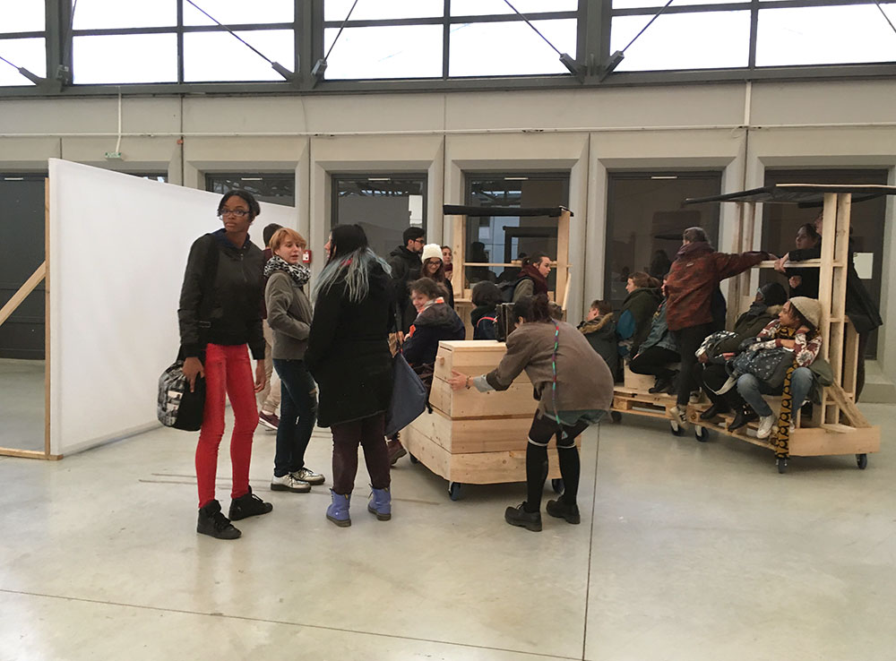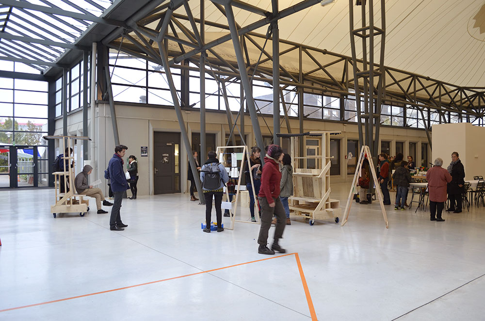 Le workshop a débuté par la présentation du projet avec les étudiant-e-s, les associations partenaires et quelques habitant-e-s. Puis nous avons élaboré ensemble le programme d’usages de cette future panoplie de mobilier, en imaginant différentes situations : au quotidien à l’école, dans des événements organisés pour la faire vivre et dans des activités communes avec les associations du quartier.