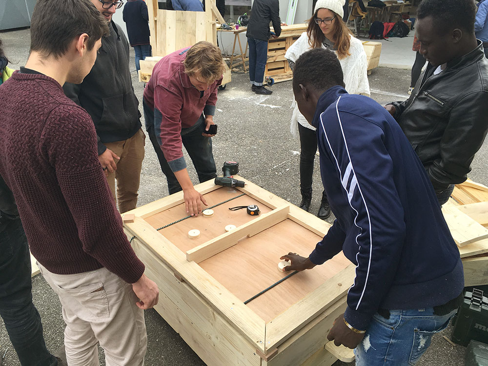 Au troisième jour, l’énergie était concentrée sur la partie construction. L’équipe « se réunir » s’était lancée dans la fabrication de deux fauteuils avec des dossiers escamotables, des rallonges pour les coupler et un jeu de palets.