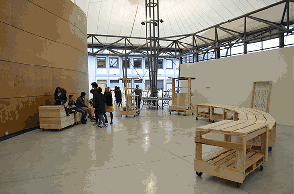 Le groupe « s’attabler » avait entreprit la fabrication d’une agora, à partir de quatre modules tables et des rallonges en trapèze pour les relier en forme d’arc de cercle.