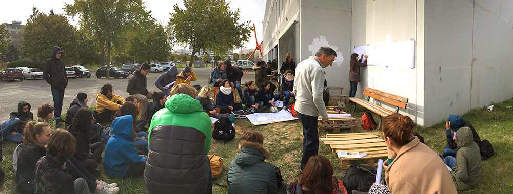 Cette année, le groupe organisateur a décidé de mettre le workshop à contribution d’un sujet brûlant : à part un petit, les étudiant-e-s ne disposent pas d’espace pour cuisiner et se réunir. Il y a bien le hall central aux airs de chapiteau, mais il n’est pas permis de l’investir, à part pour des expositions temporaires. Le parking de l’école est alors devenu le lieu de réunion pendant les pauses et les repas, ses bordures en béton faisant office de bancs. Mais l’établissement fera bientôt l’objet de travaux d’extension qui vont considérablement réduire cet espace, et risquent de compromettre la porosité et la convivialité, déjà timides, de l’école. Il serait alors idéal d’investir son parvis avant, plus vaste et ouvert sur le quartier, mais la ville en est le propriétaire.