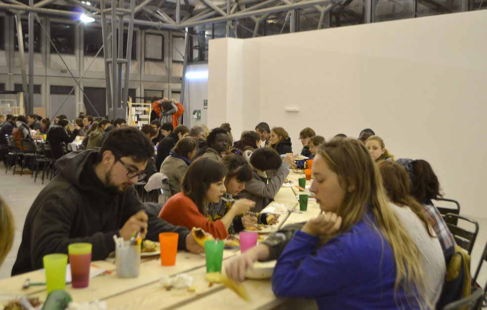 Organisé pour la deuxième fois, ce workshop consiste en la préparation d’un grand repas de quartier couplé à quatre jours d’atelier avec un-e artiste invité-e. Il mise sur la collaboration entre une trentaine d’étudiant-e-s fraîchement arrivé-e-s, l’équipe enseignante et des associations voisines.