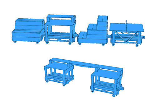 La durée du workshop étant très courte, nous avions défini à l’avance le principe de construction des wagons : des châssis sur la base de palettes montées sur roulettes, auxquelles seraient fixées des parois et des languettes d’attelage. Les choix d’usages et le design des meubles feraient l’objet des quatre jours d’atelier.